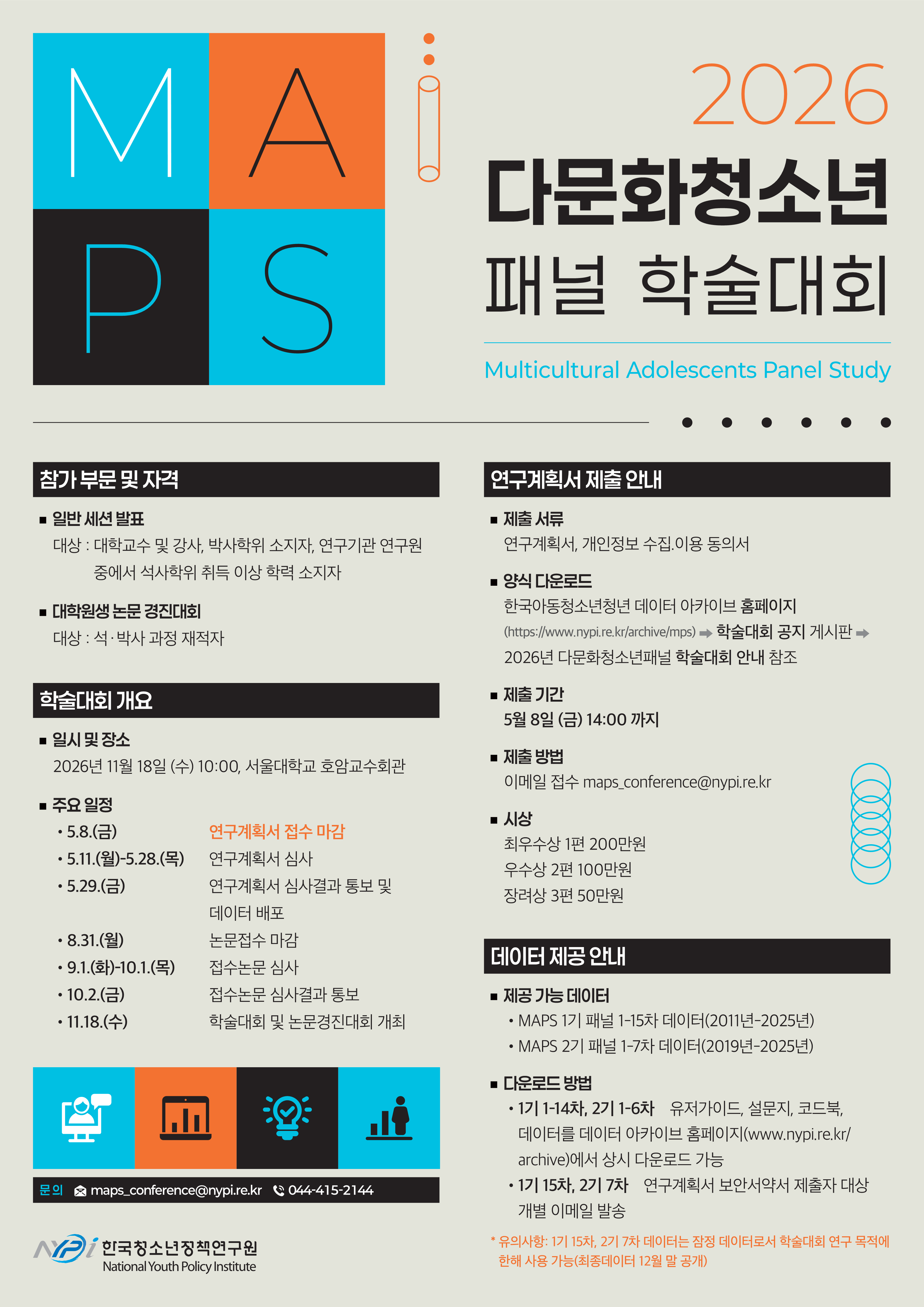 한국청소년정책연구원에서 11월 18일 (수) 다문화청소년패널 학술대회를 개최합니다(고유연구사업명: 2026 다문화청소년 종단연구). 이와 관련하여, 5월 8일 (금) 까지 연구계획서를 모집하고 있습니다.